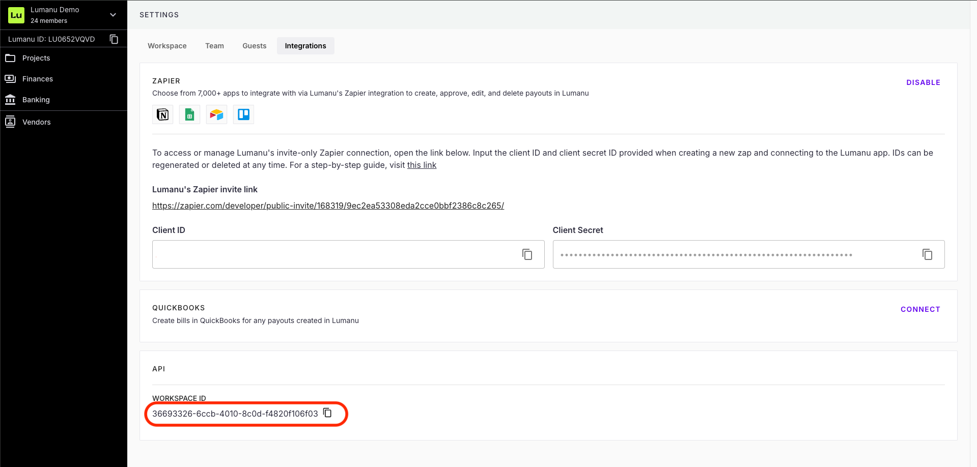 During the integration onboarding, Lumanu will create workspaces to test with. You can retrieve the ID for these on the Settings -> Integrations page: