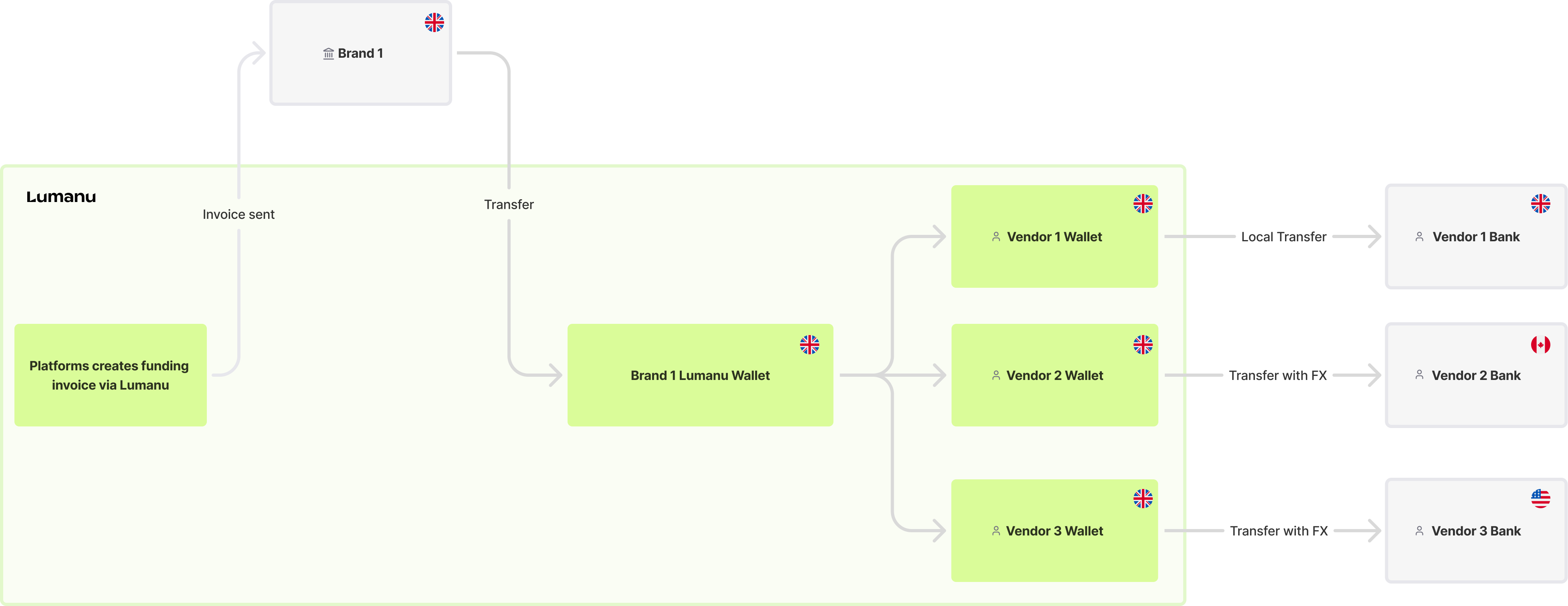 | Funds held in | Platform's Lumanu wallet | Brand's Lumanu wallet |